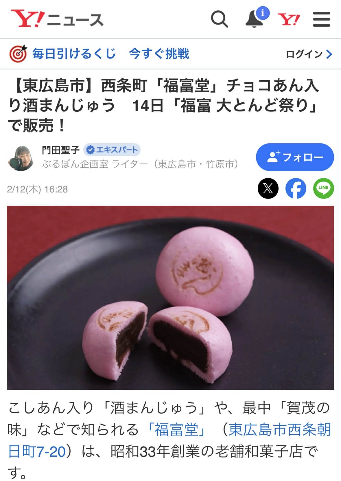 【東広島市】西条町「福富堂」チョコあん入り酒まんじゅう 14日「福富 大とんど祭り」で販売!(門田聖子) – エキスパート – Yahoo!ニュース