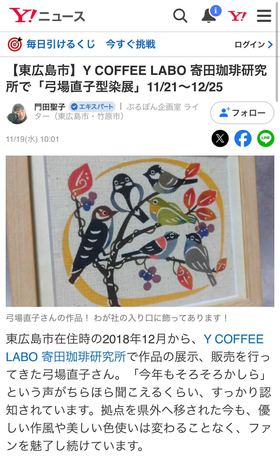 【東広島市】Y COFFEE LABO 寄田珈琲研究所で「弓場直子型染展」11/21~12/25(門田聖子) – エキスパート – Yahoo!ニュース