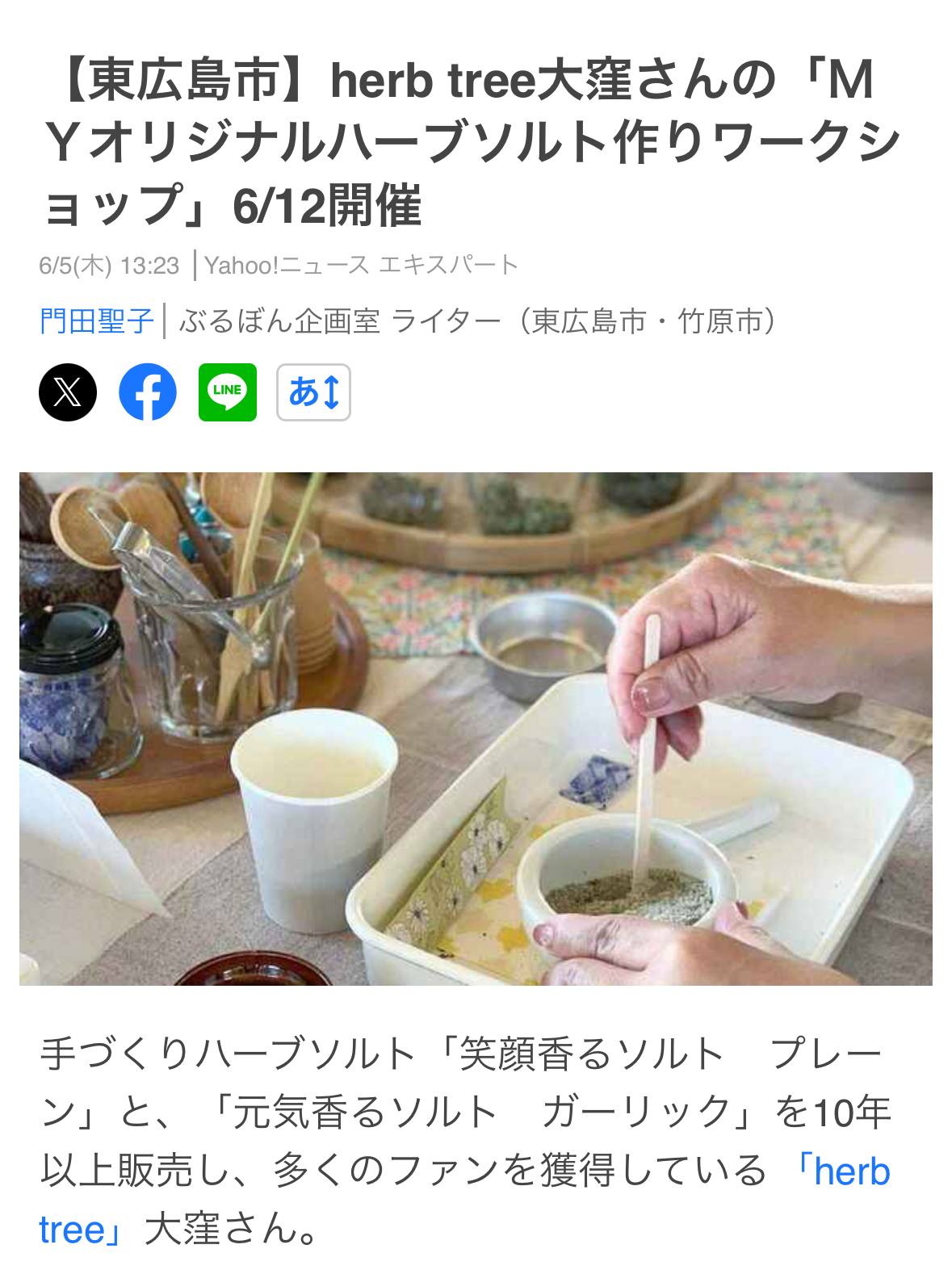 【東広島市】herb tree大窪さんの「MYオリジナルハーブソルト作りワークショップ」6/12開催