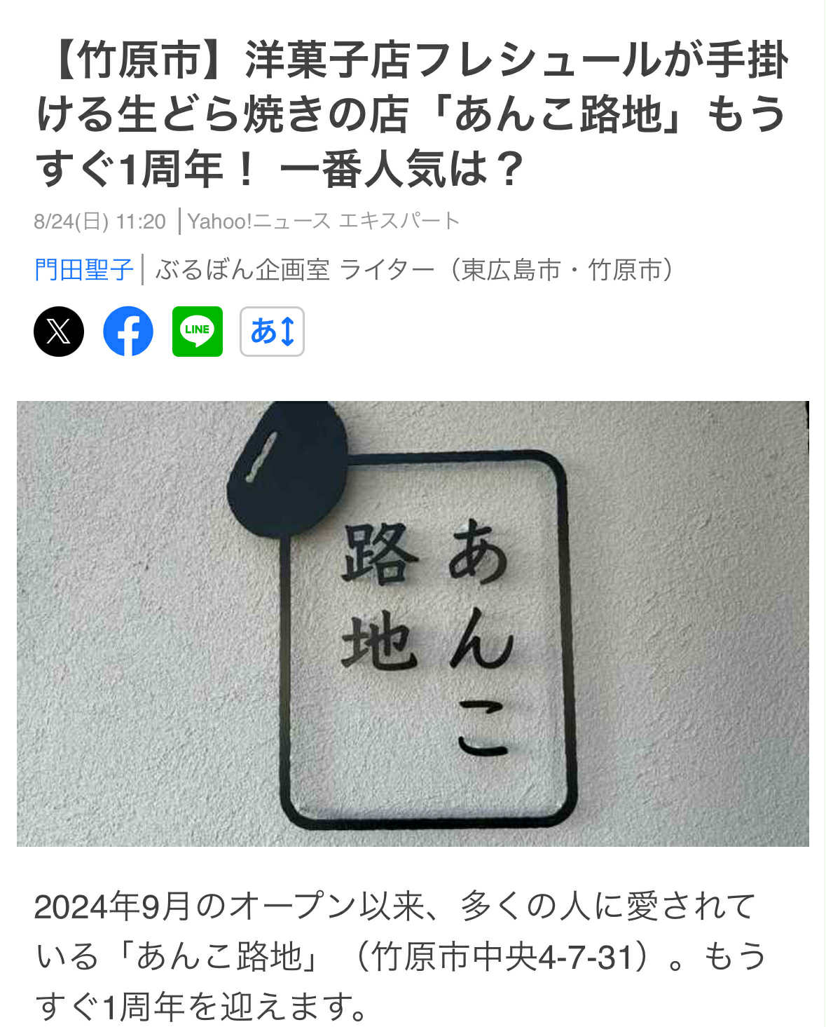 【竹原市】洋菓子店フレシュールが手掛ける生どら焼きの店「あんこ路地」もうすぐ1周年! 一番人気は?