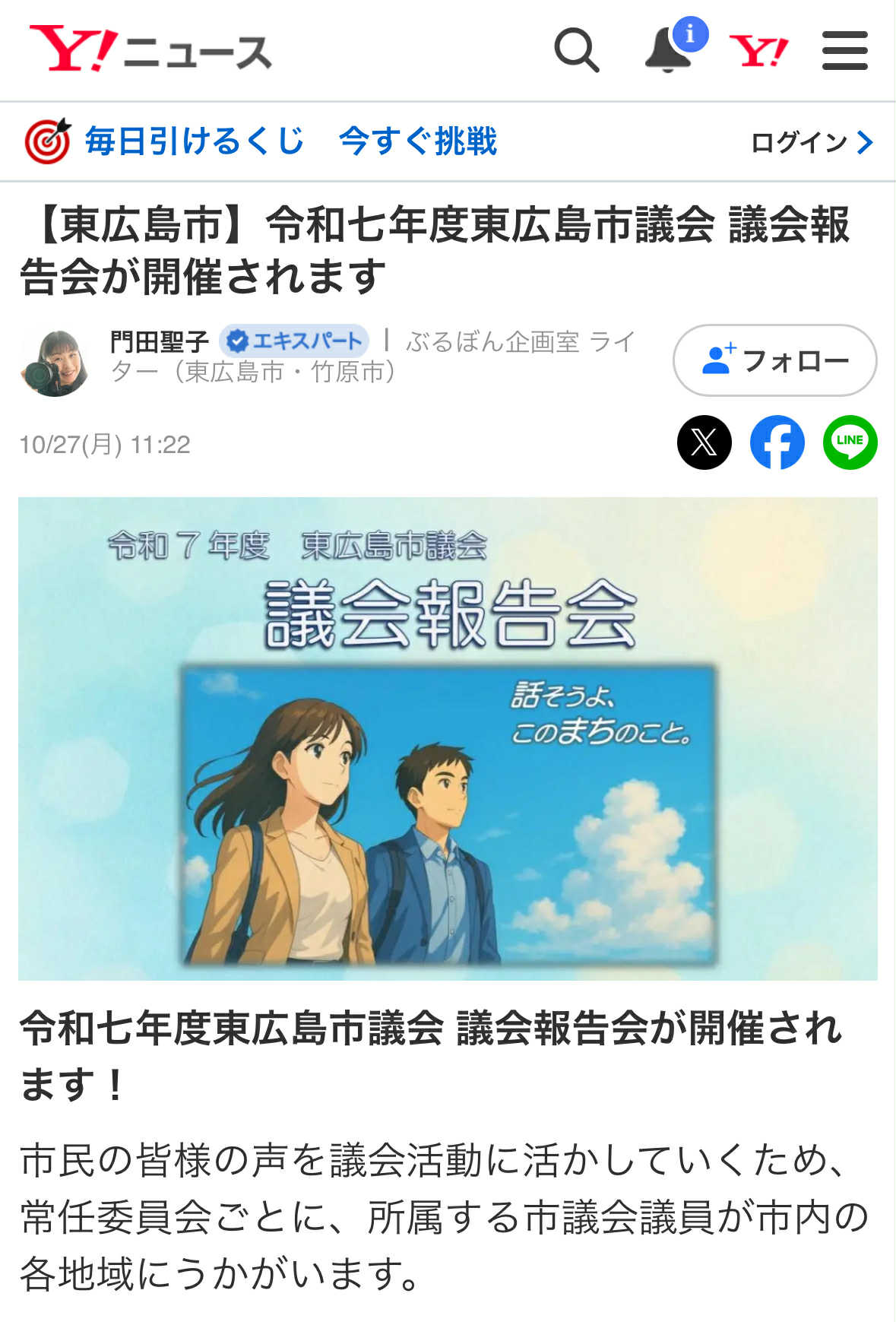 【東広島市】令和七年度東広島市議会 議会報告会が開催されます(門田聖子) – エキスパート – Yahoo!ニュース