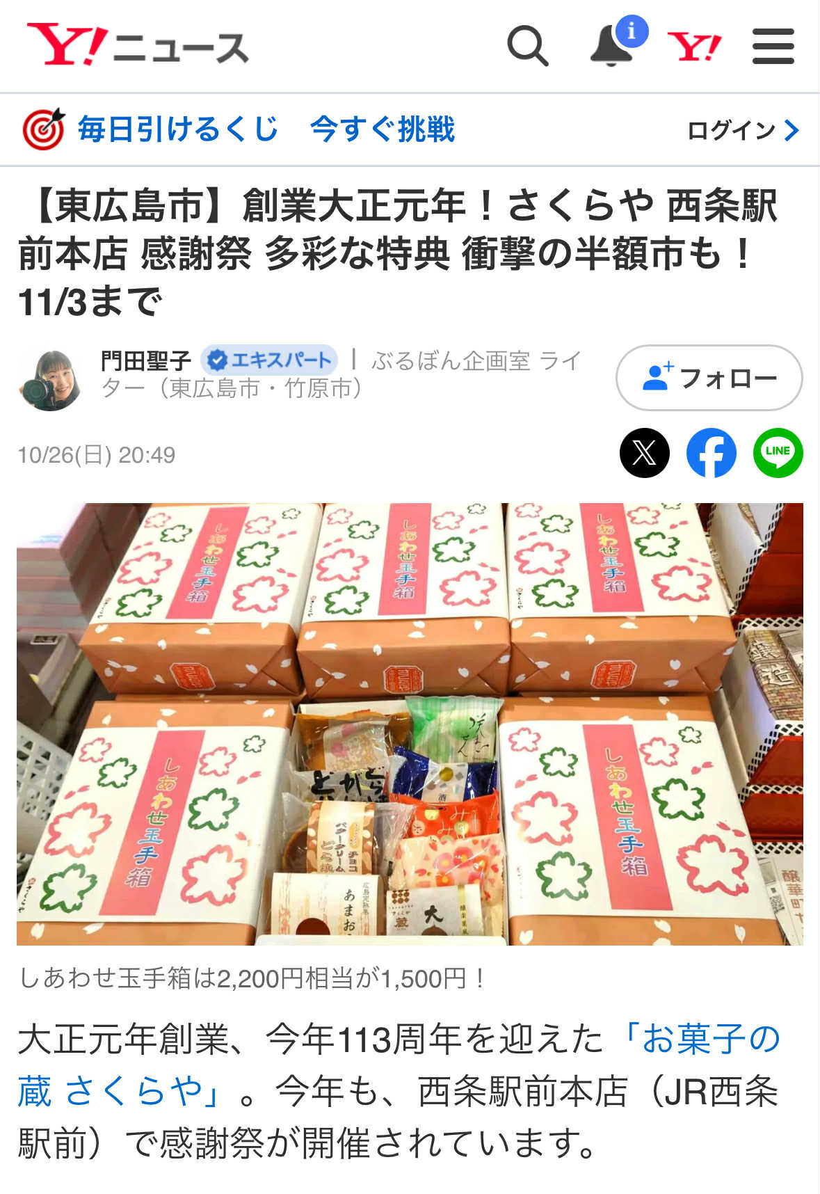 【東広島市】創業大正元年!さくらや 西条駅前本店 感謝祭 多彩な特典 衝撃の半額市も! 11/3まで(門田聖子) – エキスパート – Yahoo!ニュース