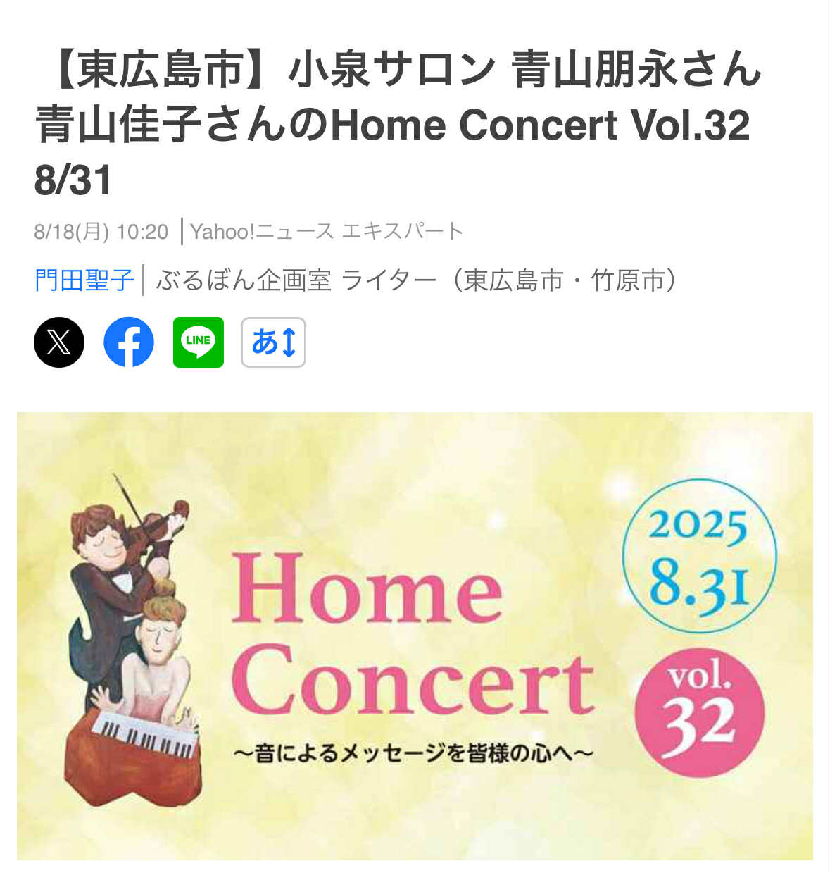 【東広島市】小泉サロン 青山朋永さん 青山佳子さんのHome Concert Vol.32 8/31
