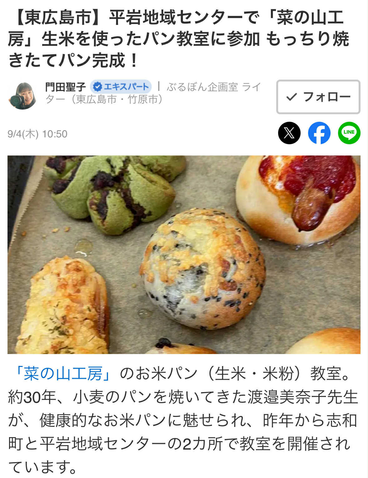 【東広島市】平岩地域センターで「菜の山工房」生米を使ったパン教室に参加 もっちり焼きたてパン完成!