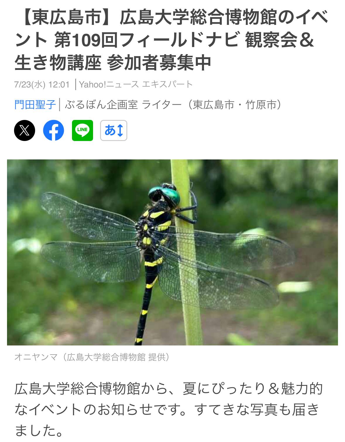 【東広島市】広島大学総合博物館のイベント 第109回フィールドナビ 観察会&生き物講座 参加者募集中