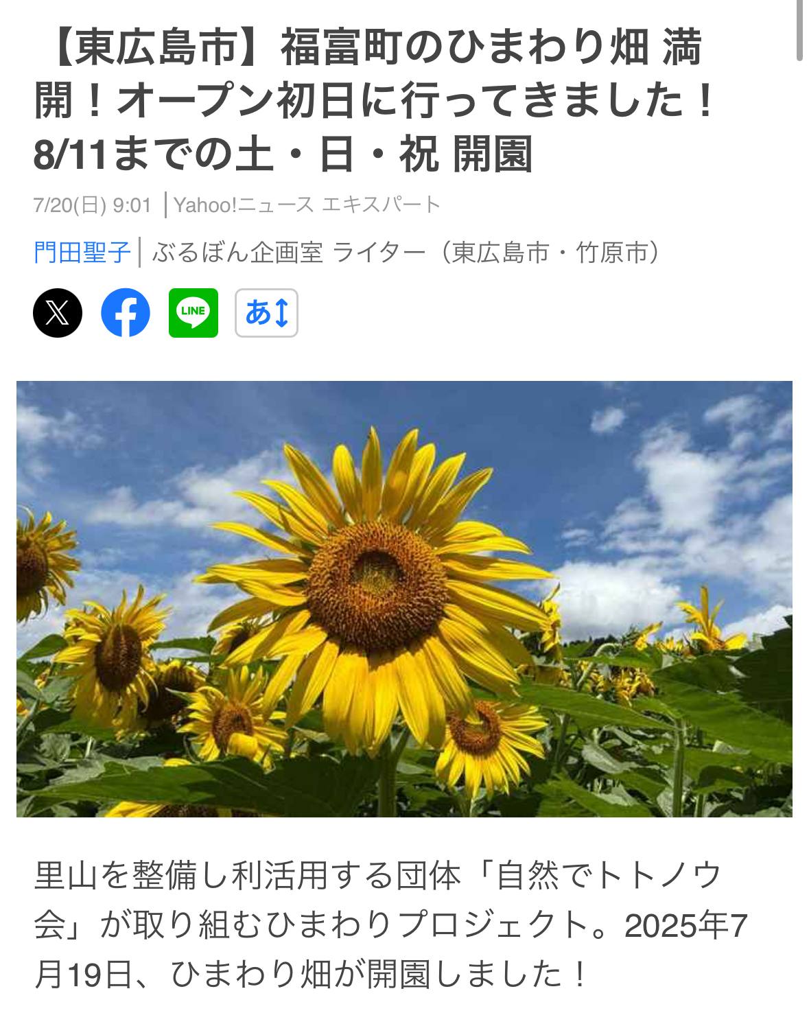 【東広島市】福富町のひまわり畑 満開!オープン初日に行ってきました!8/11までの土・日・祝 開園