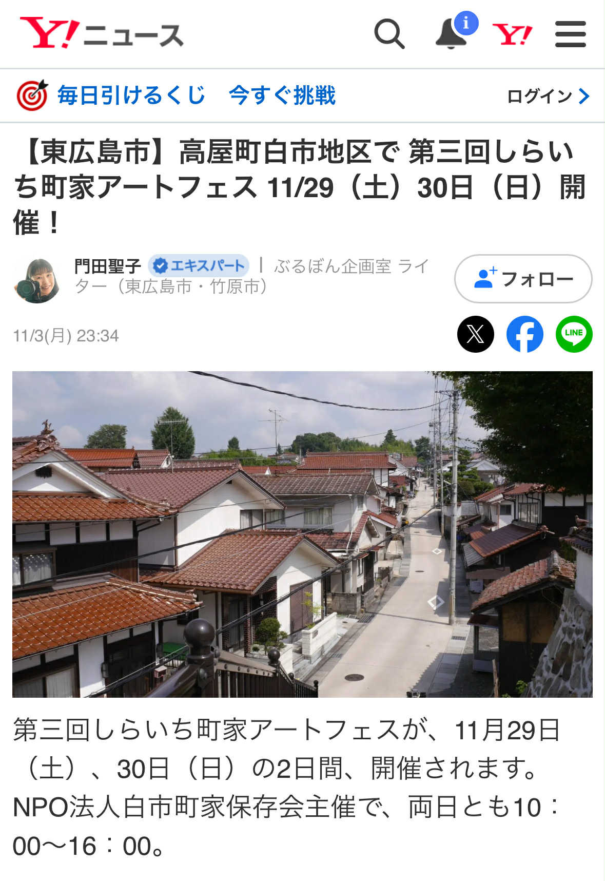 【東広島市】高屋町白市地区で 第三回しらいち町家アートフェス 11/29(土)30日(日)開催!(門田聖子) – エキスパート – Yahoo!ニュース