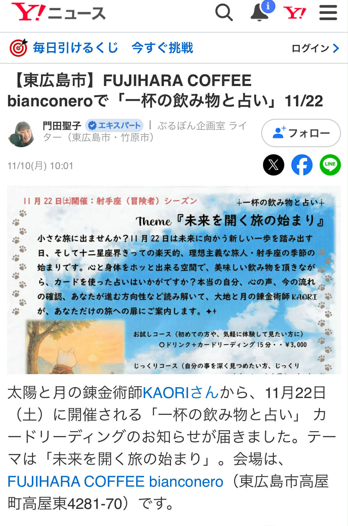 【東広島市】FUJIHARA COFFEE bianconeroで「一杯の飲み物と占い」11/22(門田聖子) – エキスパート – Yahoo!ニュース