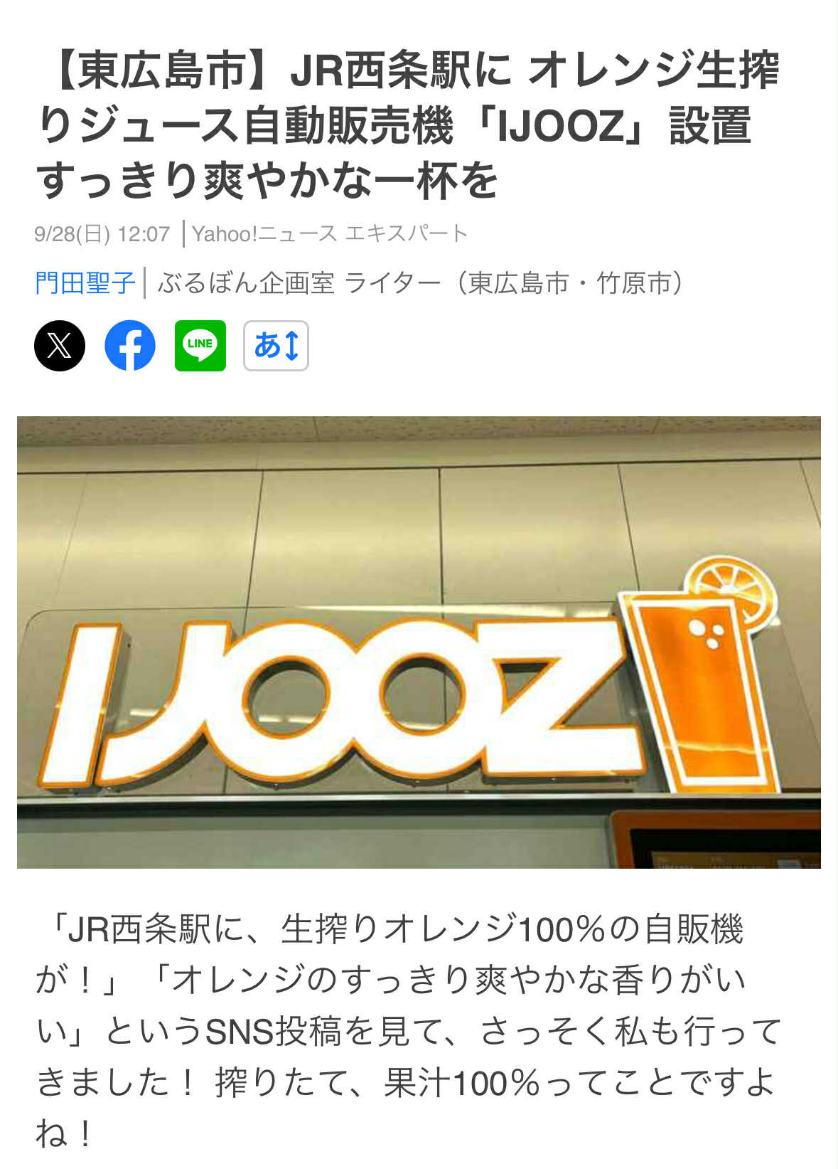 【東広島市】JR西条駅に オレンジ生搾りジュース自動販売機「IJOOZ」設置 すっきり爽やかな一杯を