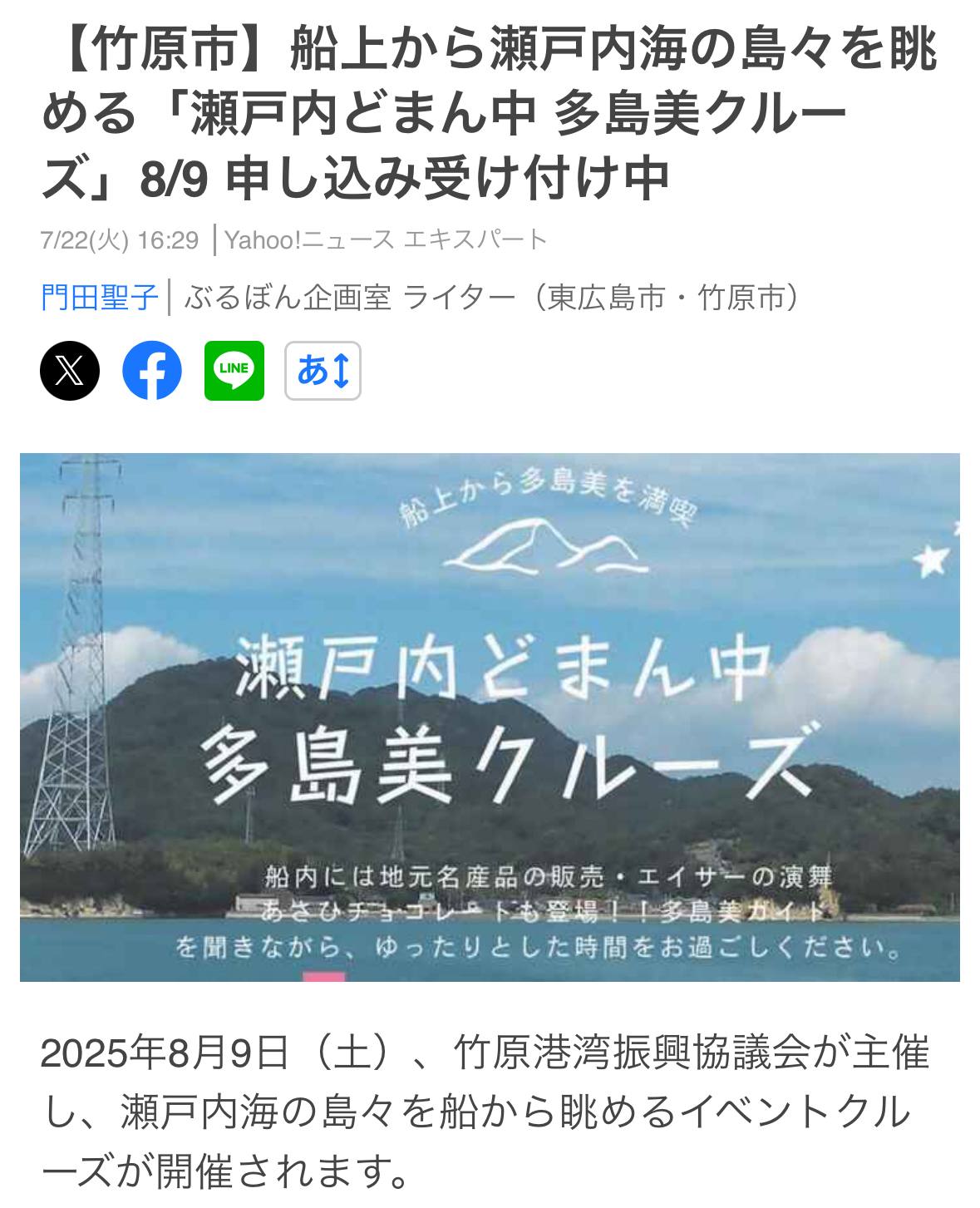 【竹原市】船上から瀬戸内海の島々を眺める「瀬戸内どまん中 多島美クルーズ」8/9 申し込み受け付け中