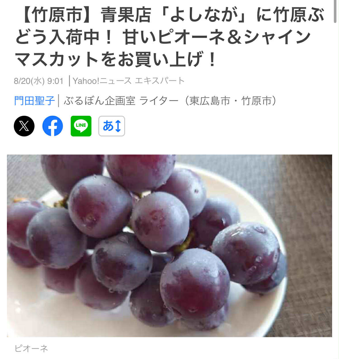 【竹原市】青果店「よしなが」に竹原ぶどう入荷中! 甘いピオーネ&シャインマスカットをお買い上げ!